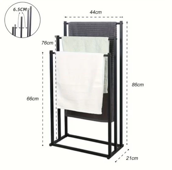 - ابعاد : طول 44 سانتی متر | عرض 21 | ارتفاع بلندترین 86 سانتی متر | ارتفاع کوتاه ترین جای حوله 66 سانتی متر